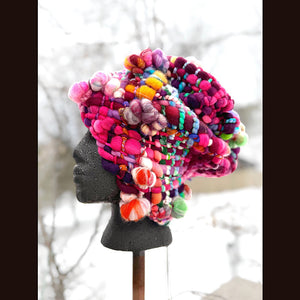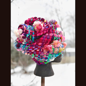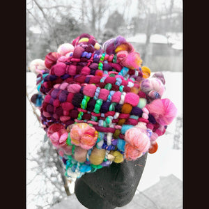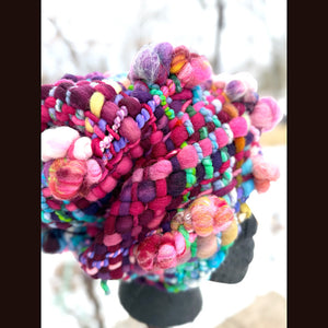 Expertly crafted from merino fiber, this hat has been created by hand weaving hand spun art yarns. The woven section has been made on my hand made loom especially crafted for this project and woven with my hand spun yarn. Everything is hand-dyed to achieve rich, saturated colors. This beanie is not for the faint of heart.
