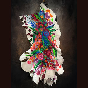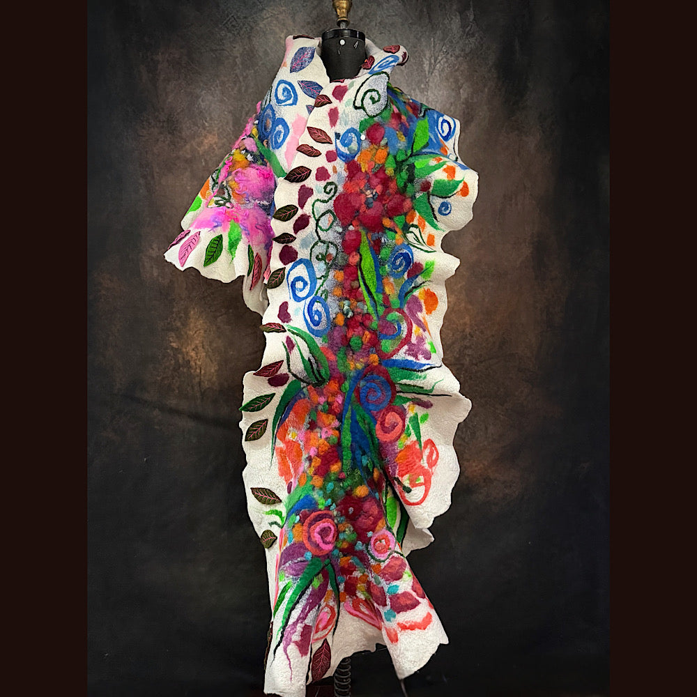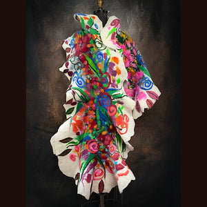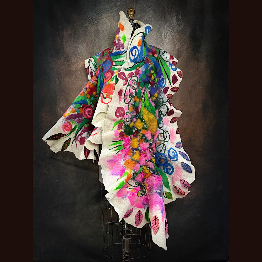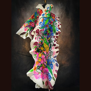 Expertly crafted from merino fiber, this ONE of a KIND very detailed felted scarf features a striking floral design that is sure to make a statement. This floral felt has been texturized with hand spun yarn bits and felt cuts from my felted flowers and leaves. I added many hand felted leaves with free motion stitching. The white areas are covered of a silk veil. Individually hand-dyed to achieve rich, saturated colors, this versatile piece can be worn in multiple styles.