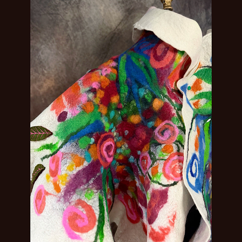 The patterns on this shawl are made from scratch. I use roving I dye and draw on my felt, layering colors. There is no short cuts. I do not use commercially made fabrics or felt or paper to create this. Its all original, unique and handmade.
