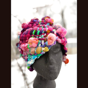 Expertly crafted from merino fiber, this hat has been created by hand weaving hand spun art yarns. The woven section has been made on my hand made loom especially crafted for this project and woven with my hand spun yarn. Everything is hand-dyed to achieve rich, saturated colors. This beanie is not for the faint of heart.