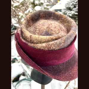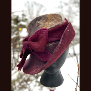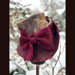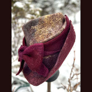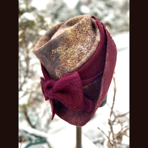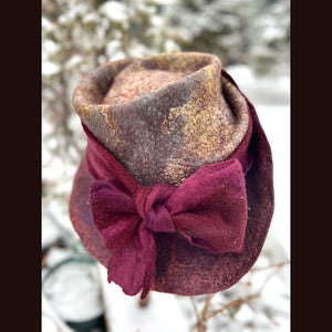 This felted top hat with bow is crafted from luxurious merino with silk. With a size of 23.5 inches, it can comfortably fit head circumferences between 21 and 22.5 inches (medium to large). The model, with a head circumference of 21 inches, wears it loosely and still looks stunning. The hat has a medium thickness and is malleable for a perfect fit. All colors are hand-dyed and the felt is crafted from scratch without any prefelt. Elevate your style with this exclusive and elegant hat.
