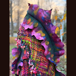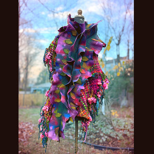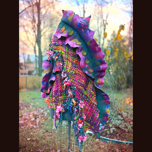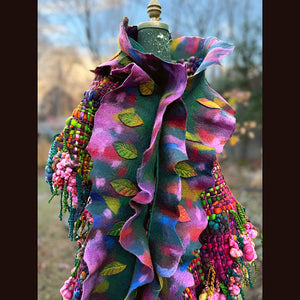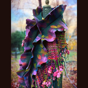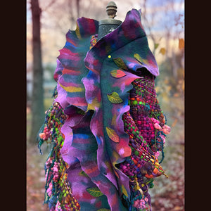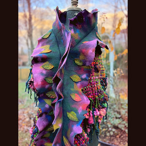 Expertly crafted from merino fiber, this scarf has been created from a blend of weaving and felting. The woven section has been made on a 7 foot long hand made loom and woven with my hand spun yarn. There is a considerable amount of yarns involved in this shawl. 5 different skeins have been spun to create those effects. The felt part has been meticulously designed and adorned with felted leaves with free motion embroidery. The felted section has patterns on both sides. Everything is hand-dyed to achieve rich, saturated colors, this versatile piece can be worn in multiple styles.