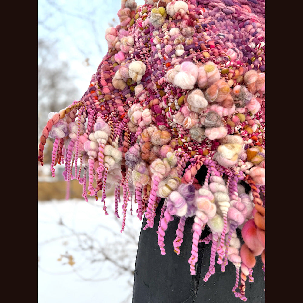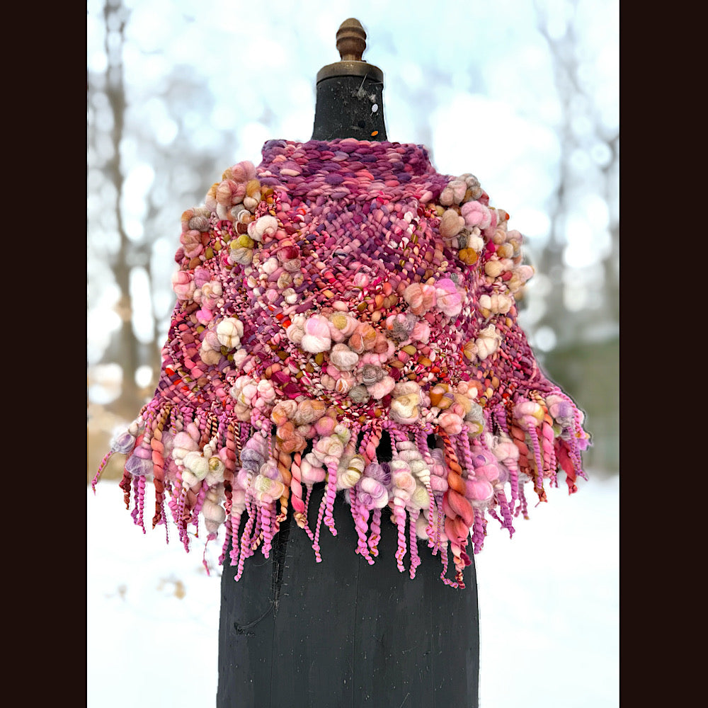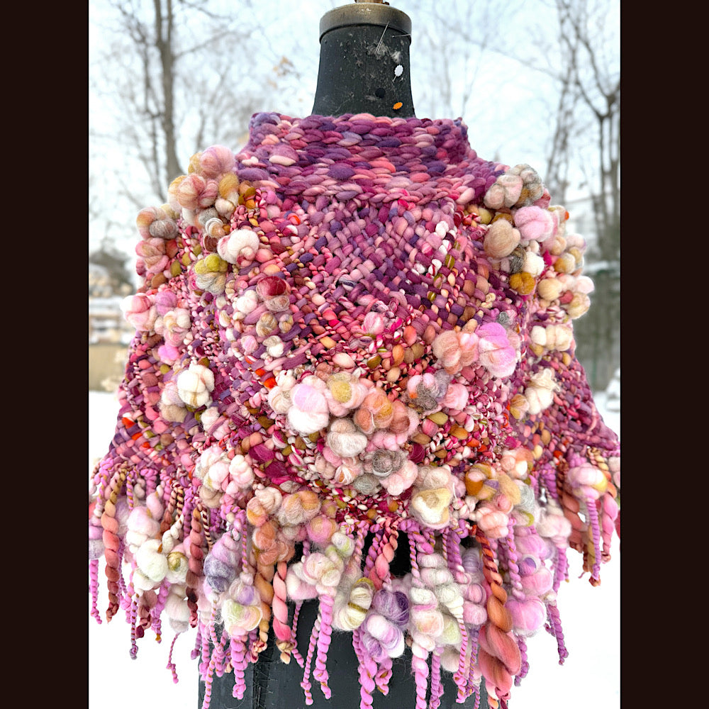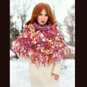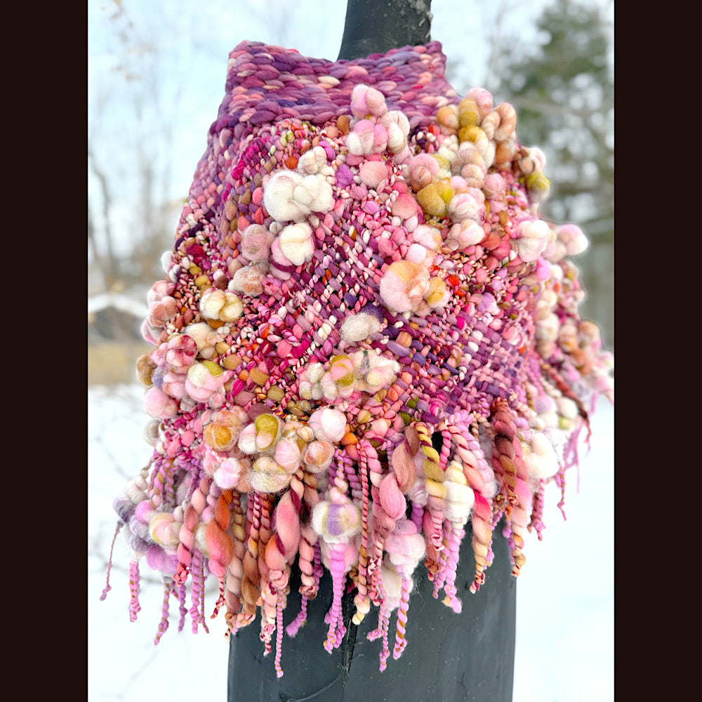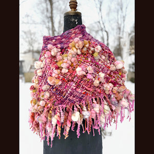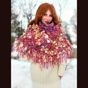 Expertly crafted from merino fiber, this shawl has been created by hand weaving hand spun art yarns. The woven section has been made on hand made loom especially crafted for this project and woven with my hand spun yarn. There is a considerable amount of yarns involved in this shawl. 5 different skeins have been spun to create that scarf shawlette. On this particular one I crocheted a border on top to add length and shape (see it can be folded). Just the fringe took an entire skein of hand spun. Everything is hand-dyed to achieve rich, saturated colors, this versatile piece can be worn in multiple styles.