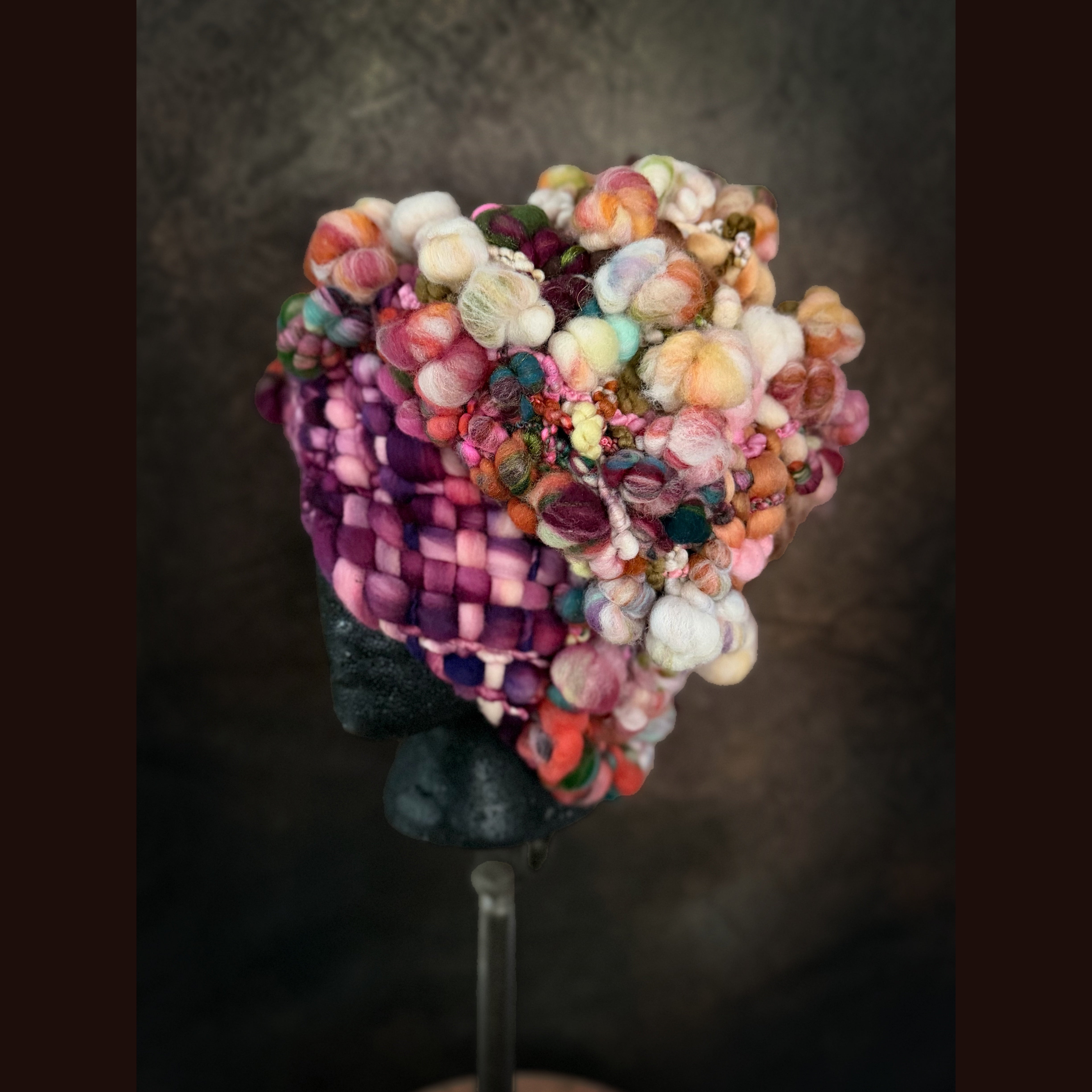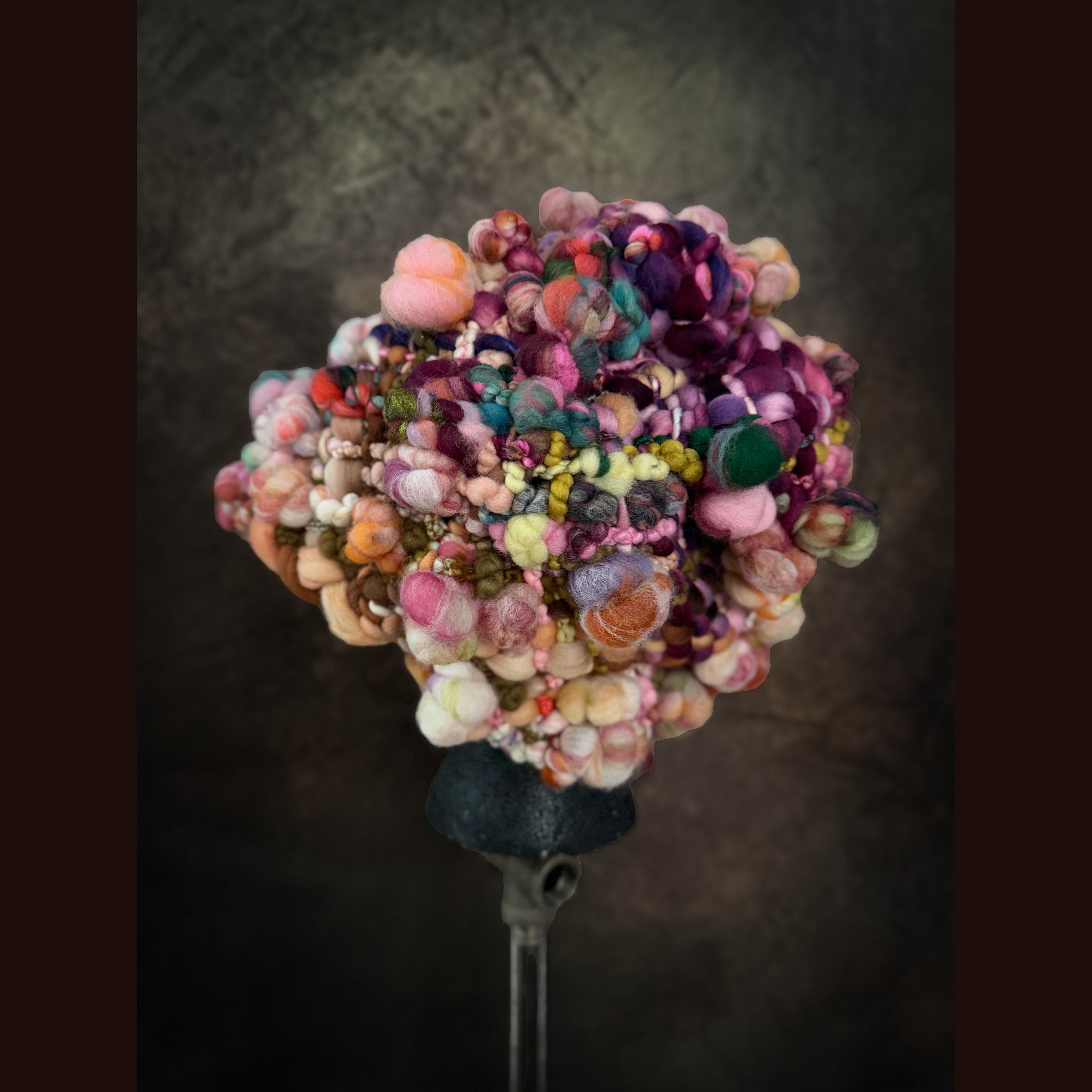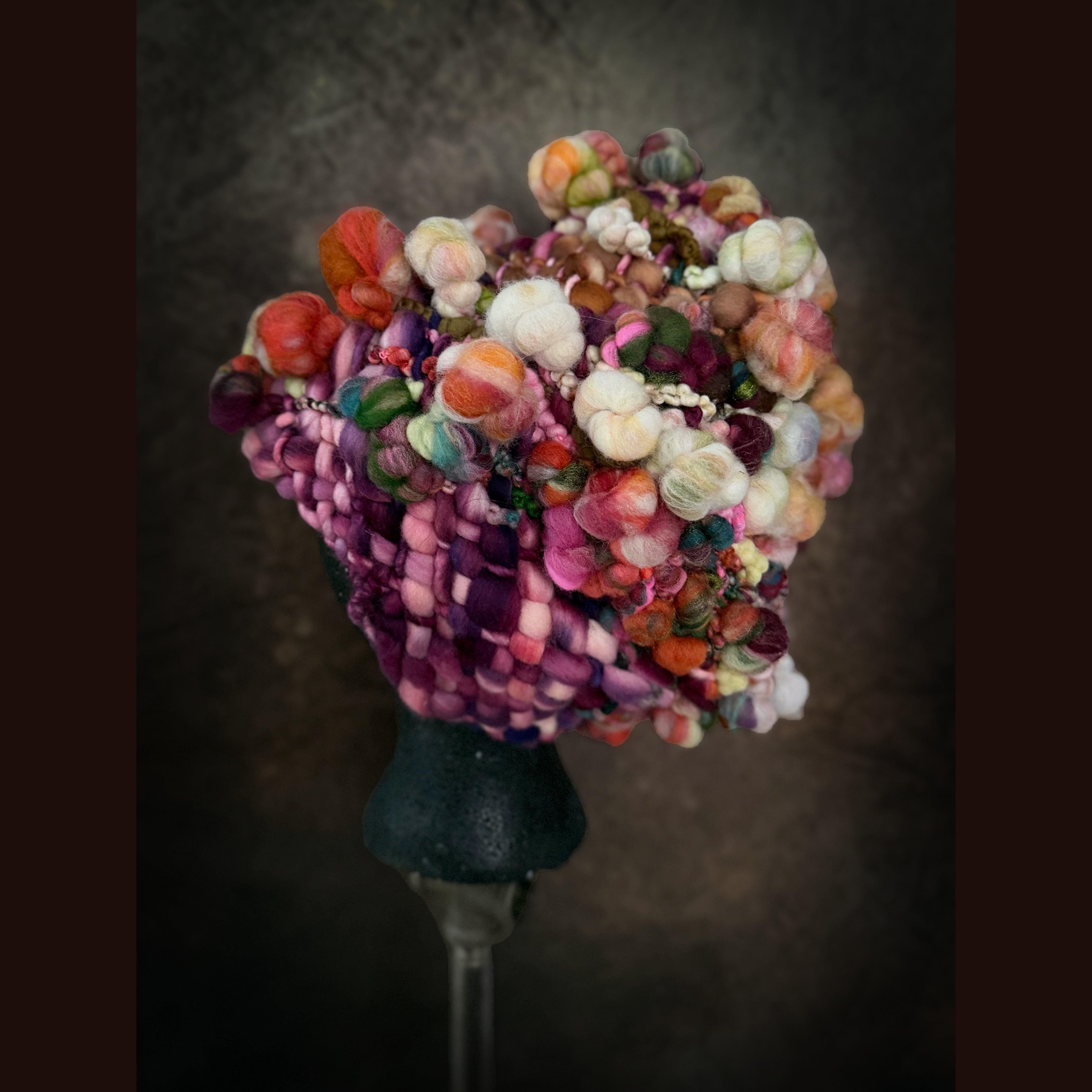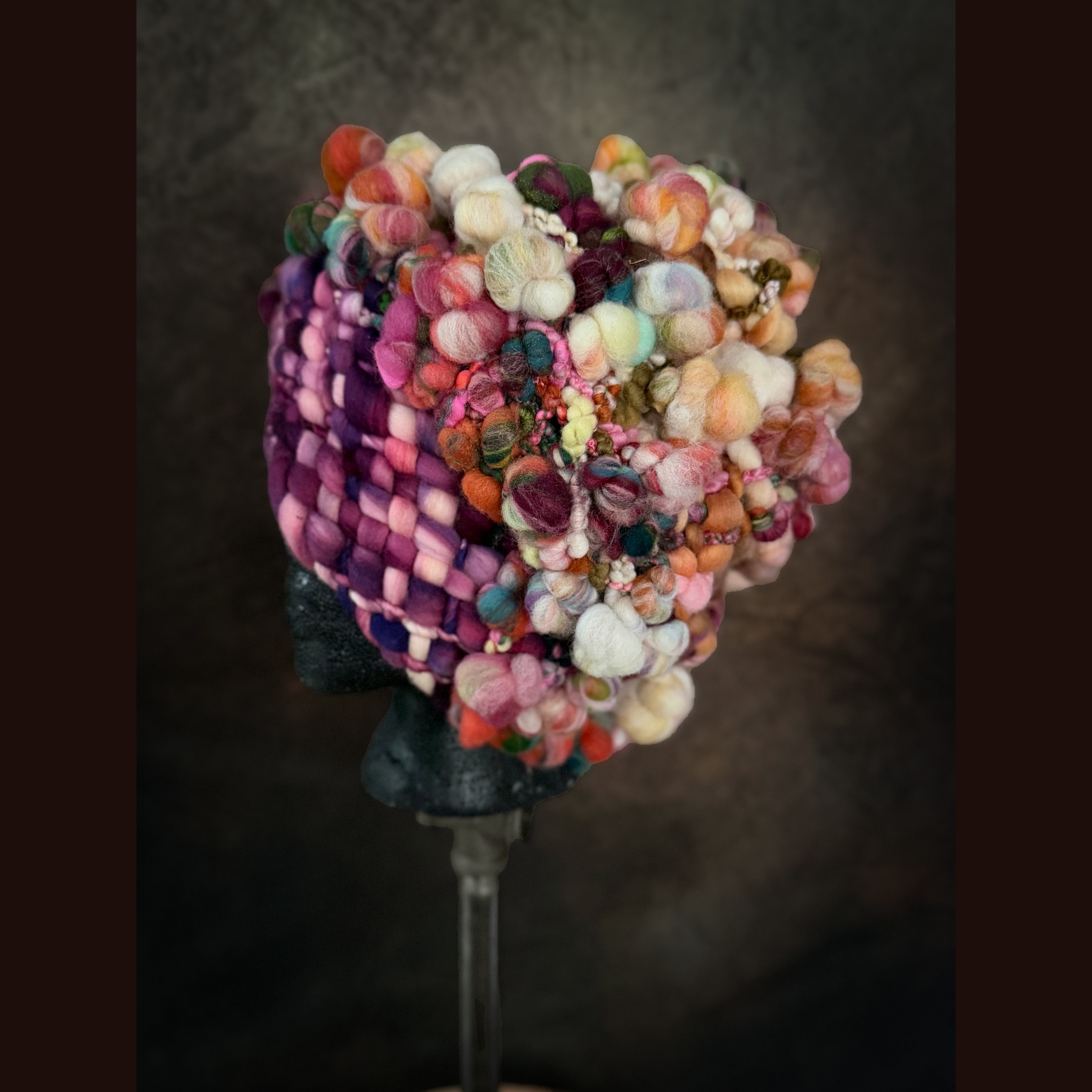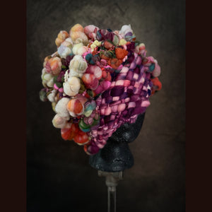 Expertly crafted from merino fiber, this hat has been created by hand weaving hand spun art yarns. The woven section has been made on my hand made loom especially crafted for this project and woven with my hand spun yarn. Everything is hand-dyed to achieve rich, saturated colors. This beanie is not for the faint of heart.