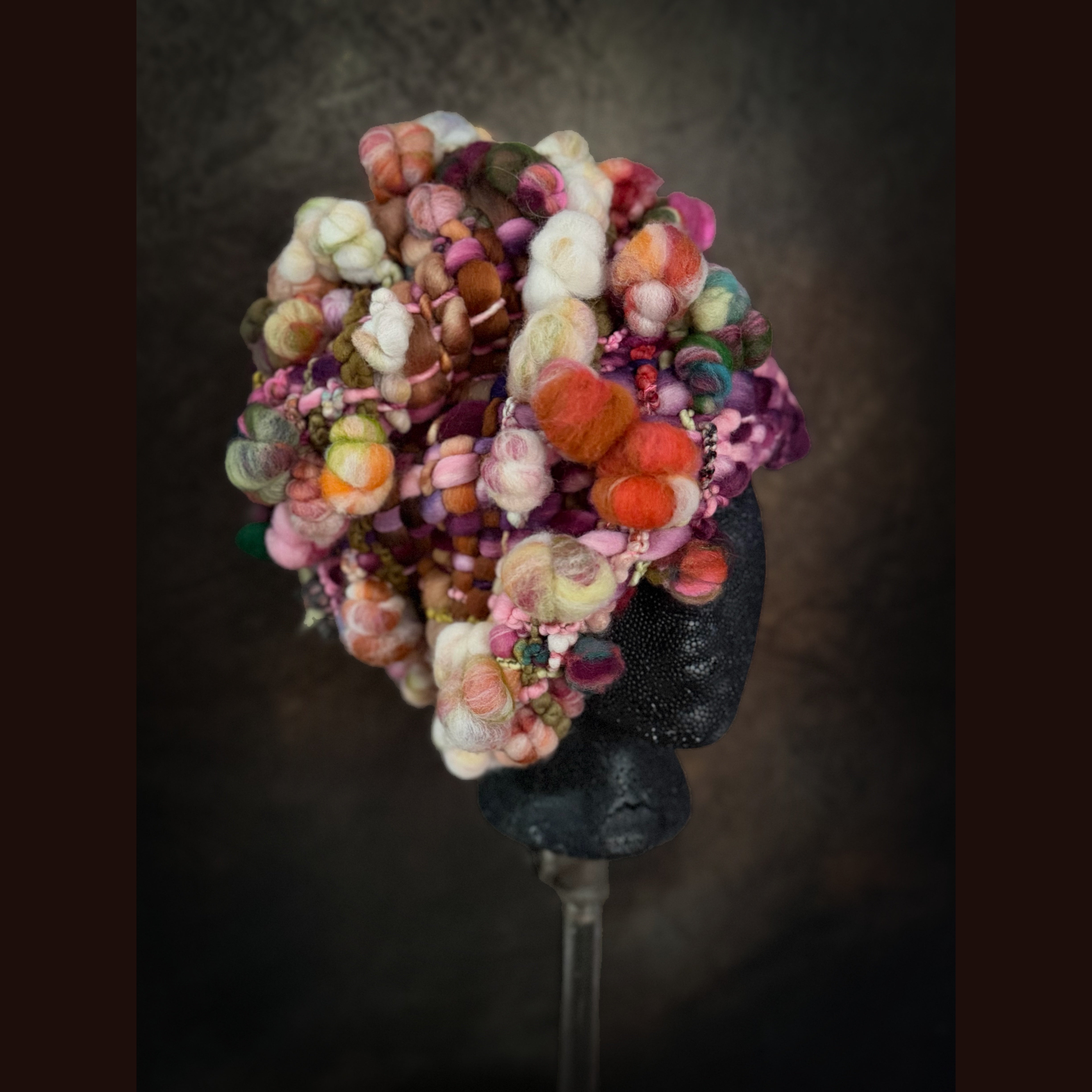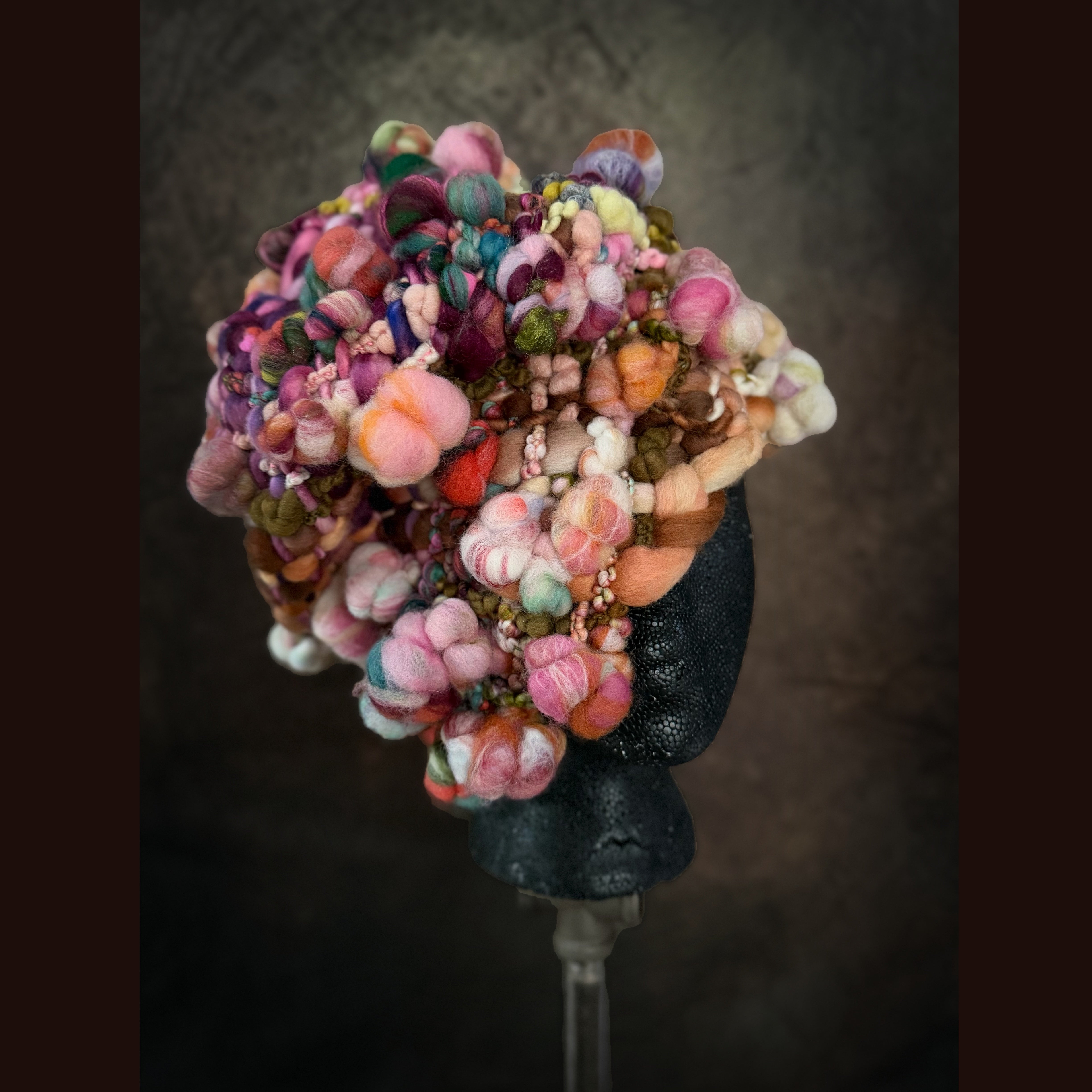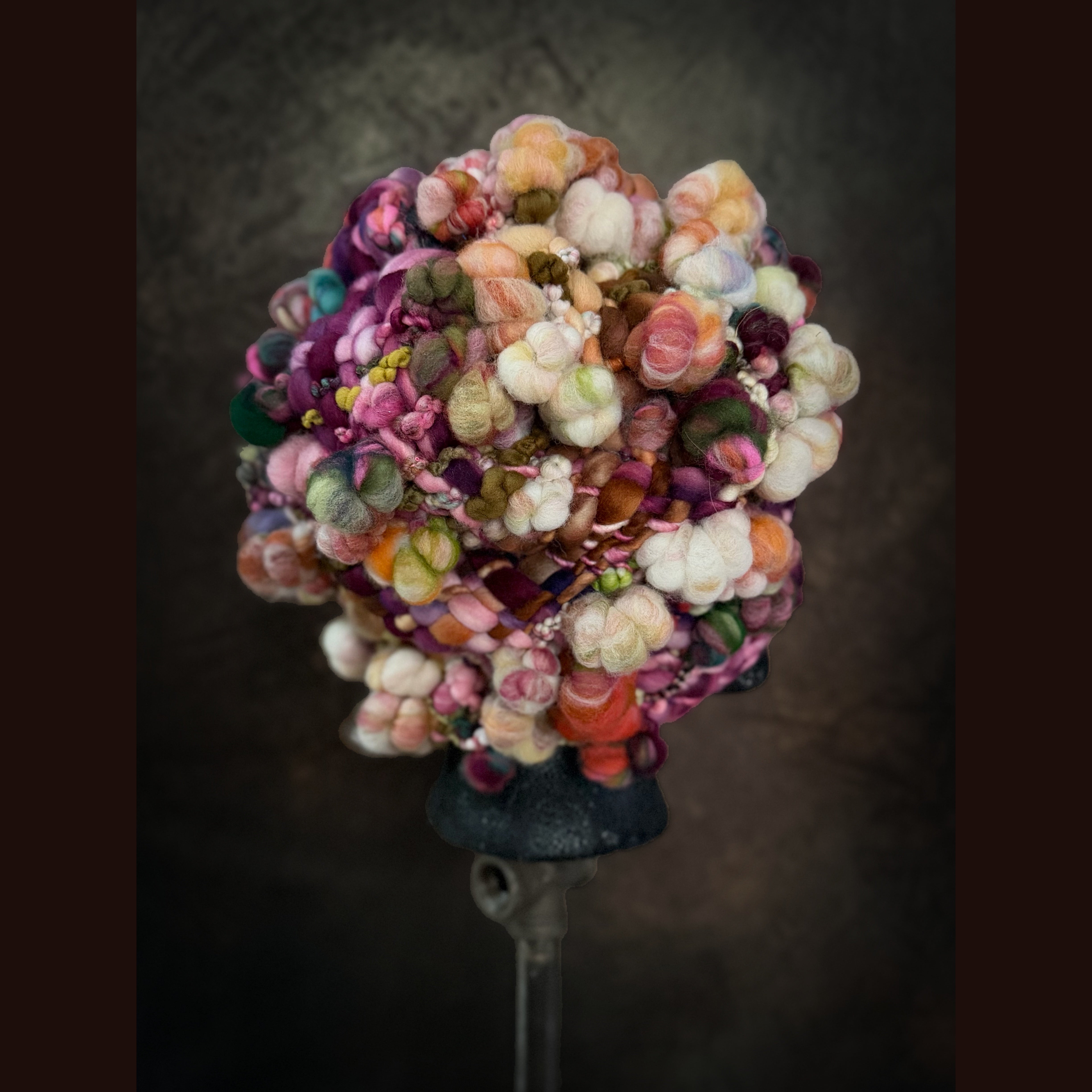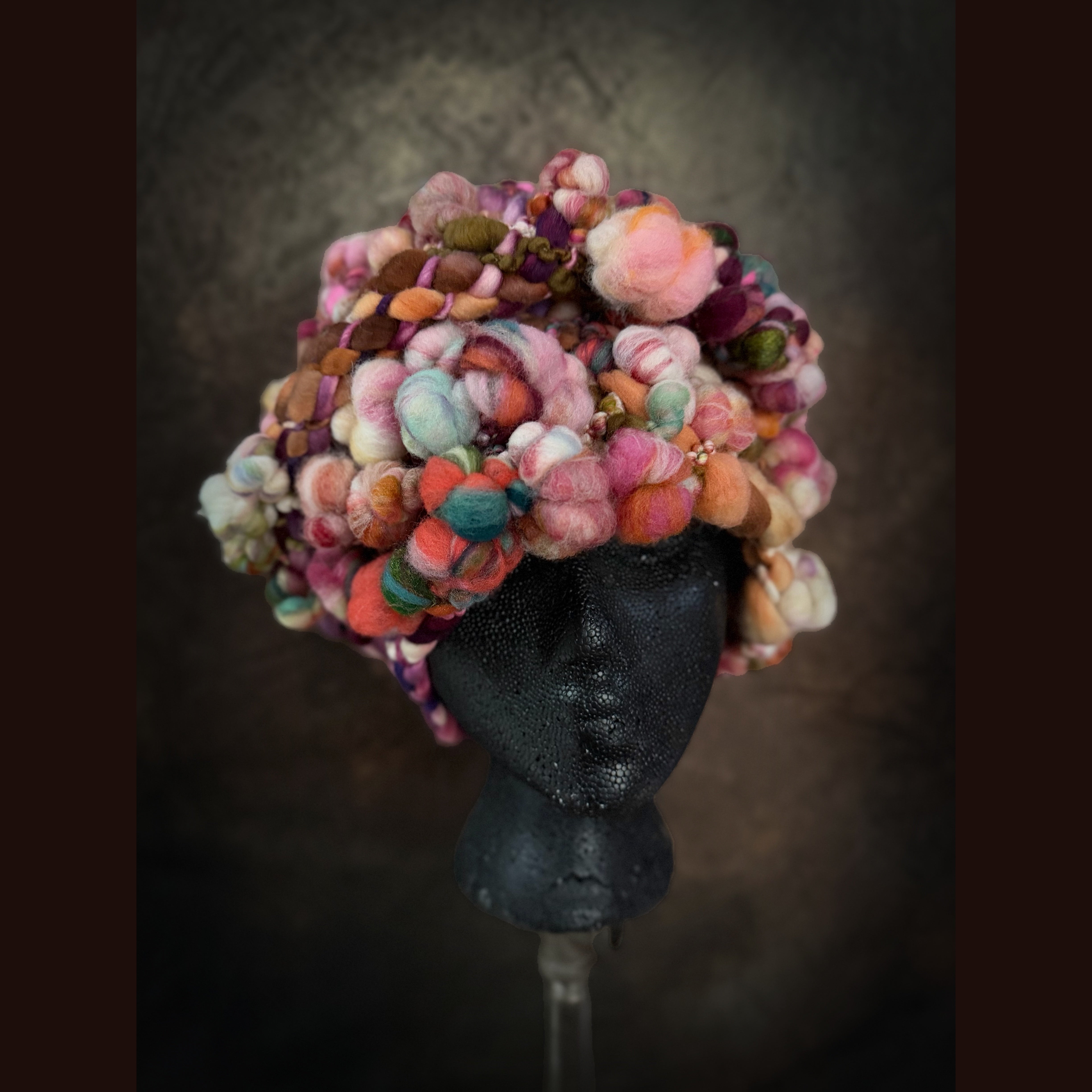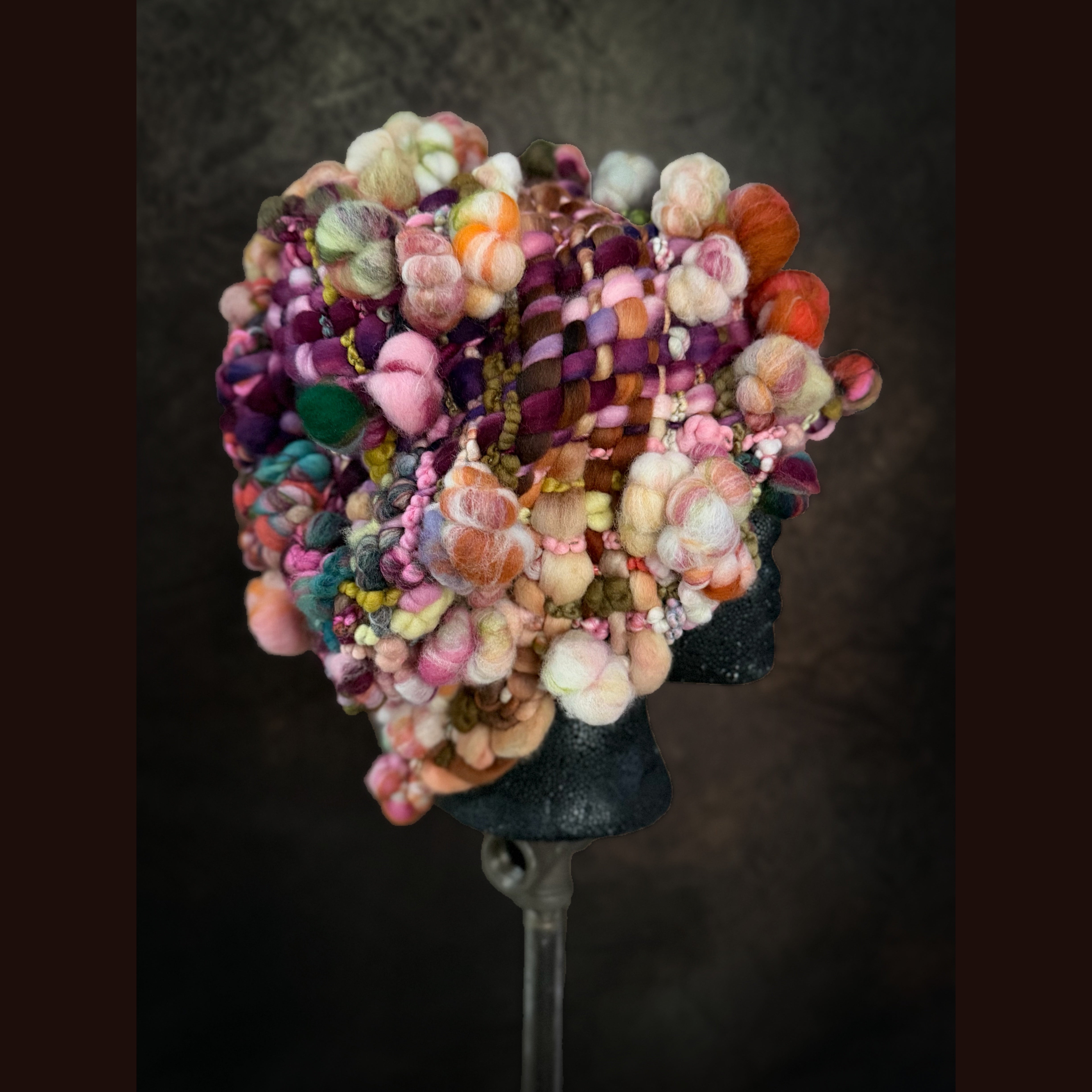 Expertly crafted from merino fiber, this hat has been created by hand weaving hand spun art yarns. The woven section has been made on my hand made loom especially crafted for this project and woven with my hand spun yarn. Everything is hand-dyed to achieve rich, saturated colors. This beanie is not for the faint of heart.