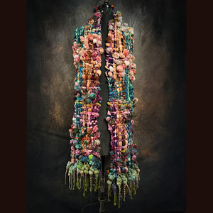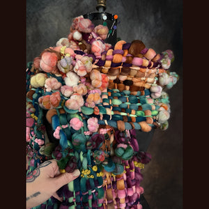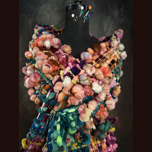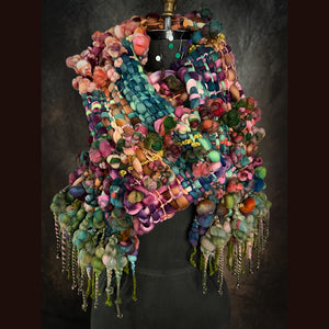 Expertly crafted from merino fiber, this scarf has been created by hand weaving hand spun art yarns. This weaving has been created on hand made loom especially crafted for this project and woven with my hand spun yarn. There is a considerable amount of yarns involved in this shawl. 8 different skeins have been spun to create this scarf. This scarf is narrower than my previous ones, it makes it easier to wrap. Everything is hand-dyed to achieve the perfect color palette. This versatile piece can be worn in multiple styles.