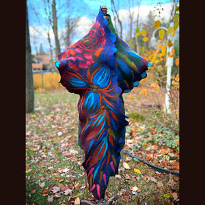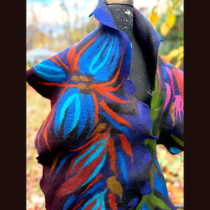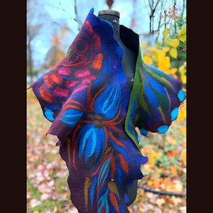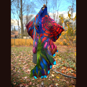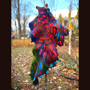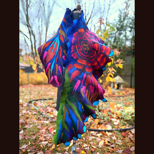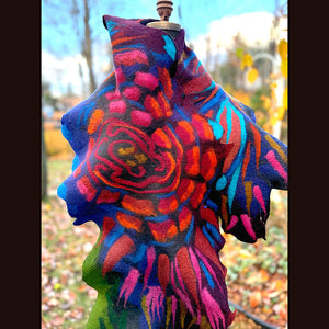 The patterns on this shawl are made from scratch. I use roving I dye and draw on my felt, layering colors. There is no short cuts. I do not use commercially made fabrics or felt or paper to create this. Its all original, unique and handmade.