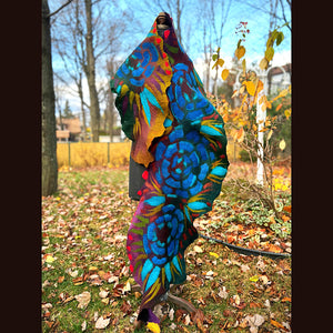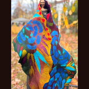 The patterns on this shawl are made from scratch. I use roving I dye and draw on my felt, layering colors. There is no short cuts. I do not use commercially made fabrics or felt or paper to create this. Its all original, unique and handmade.