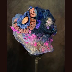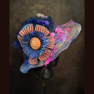 Expertly crafted from merino and silk wool felted hat .This hat size is easy to wear has it is not as tall as my usual top hat. It is felt with many curly locks with silk almost everywhere .The flowers are all made from felt I made (not bought), stitched and needle felted plus a lovely collector vintage button.