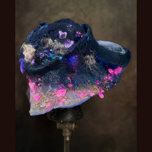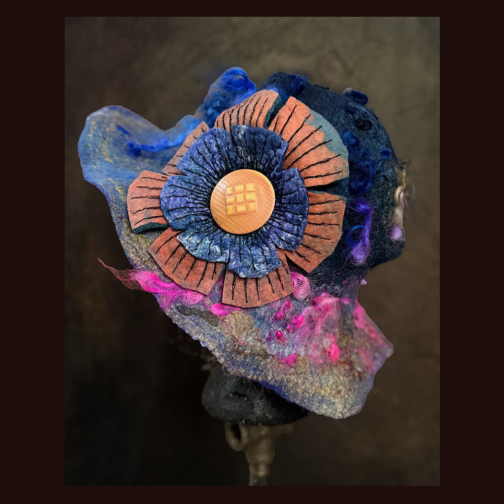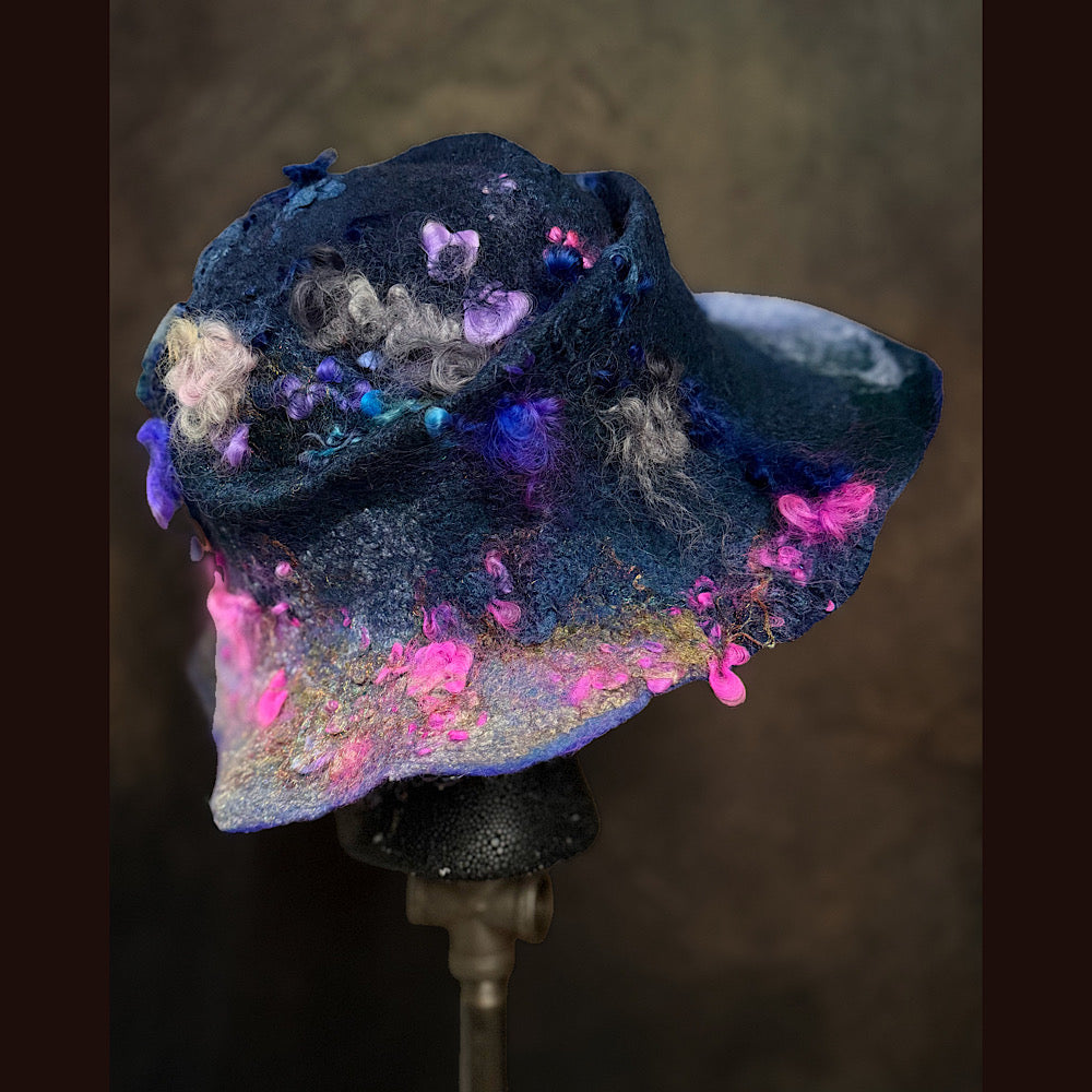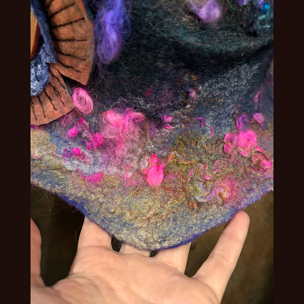 The color variations on this hat are made from scratch. I use roving I dye and draw on my felt, layering colors. There is no short cuts. I do not use commercially made fabrics or felt or paper to create this. Its all original, unique and handmade.
