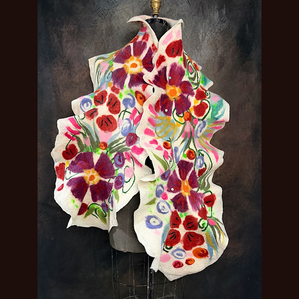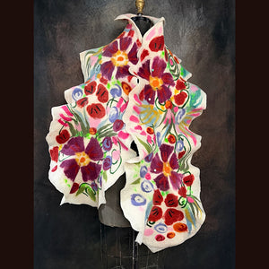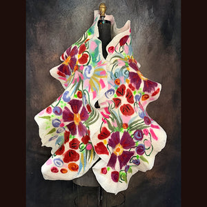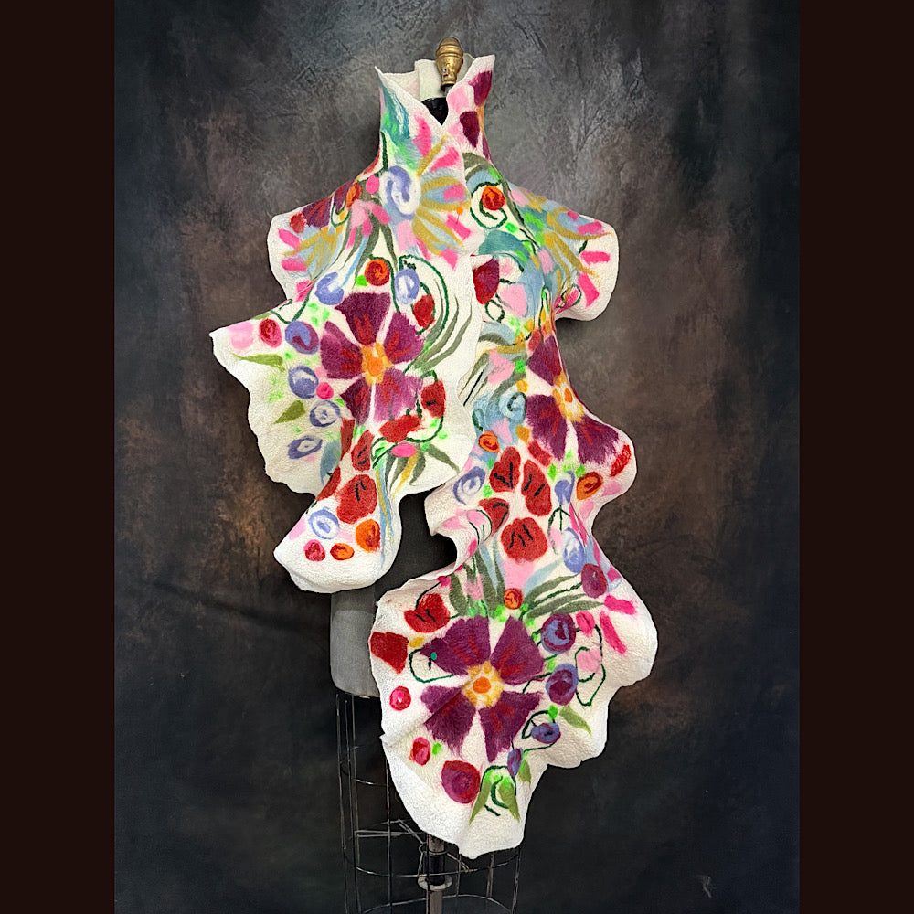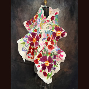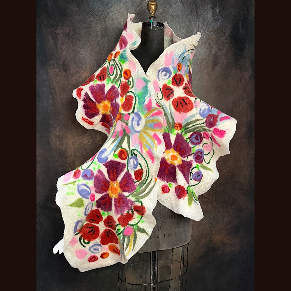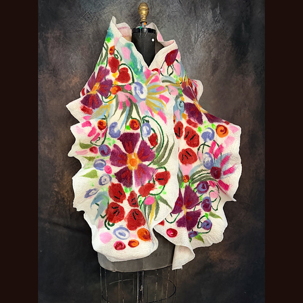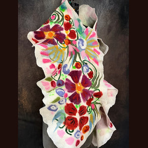 Expertly crafted from merino fiber, this ONE of a KIND felted  scarf features a striking detailed floral design that is sure to make a statement. All my fibres are Individually hand-dyed to achieve rich, saturated colors, this versatile piece can be worn in multiple styles. There is some silk over the white areas to give shine and contrast.