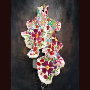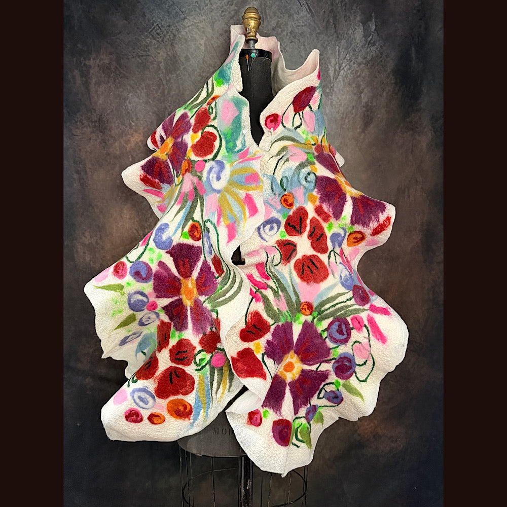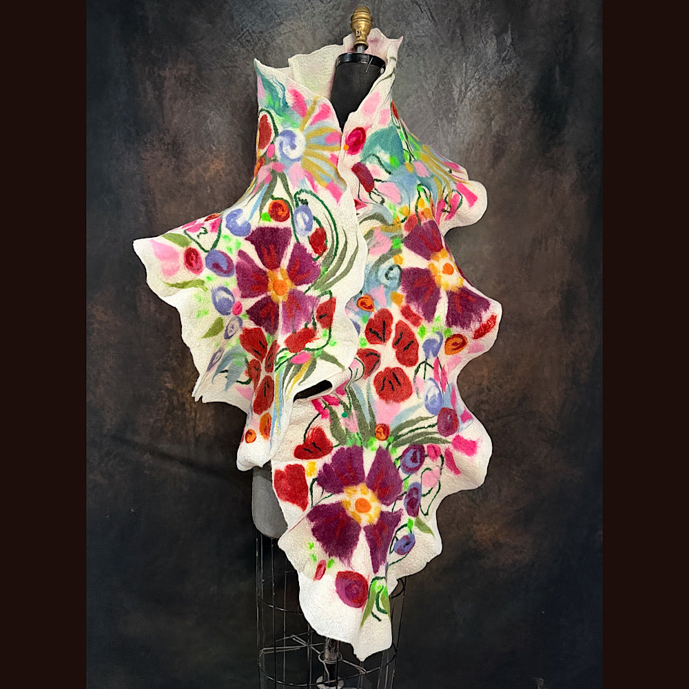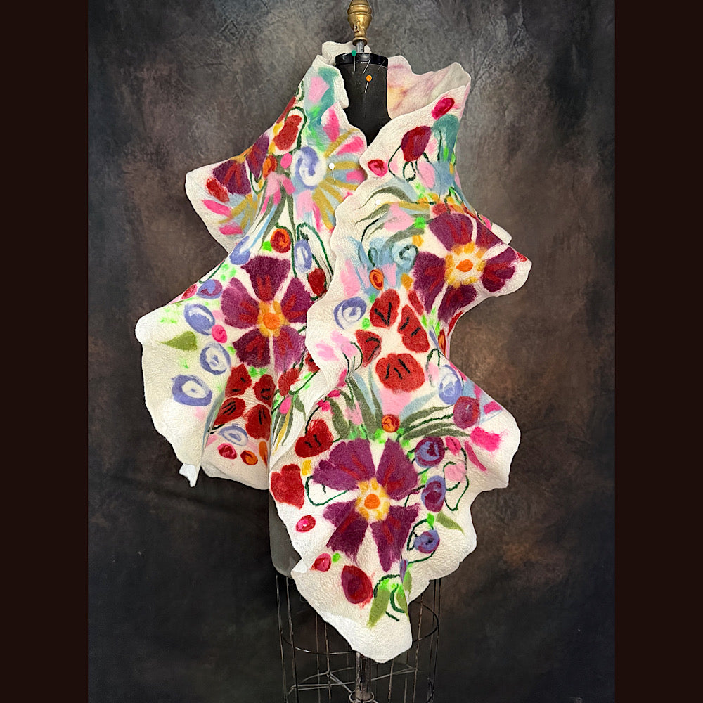The patterns on this shawl are made from scratch. I use roving I dye and draw on my felt, layering colors. There is no short cuts. I do not use commercially made fabrics or felt or paper to create this. Its all original, unique and handmade.