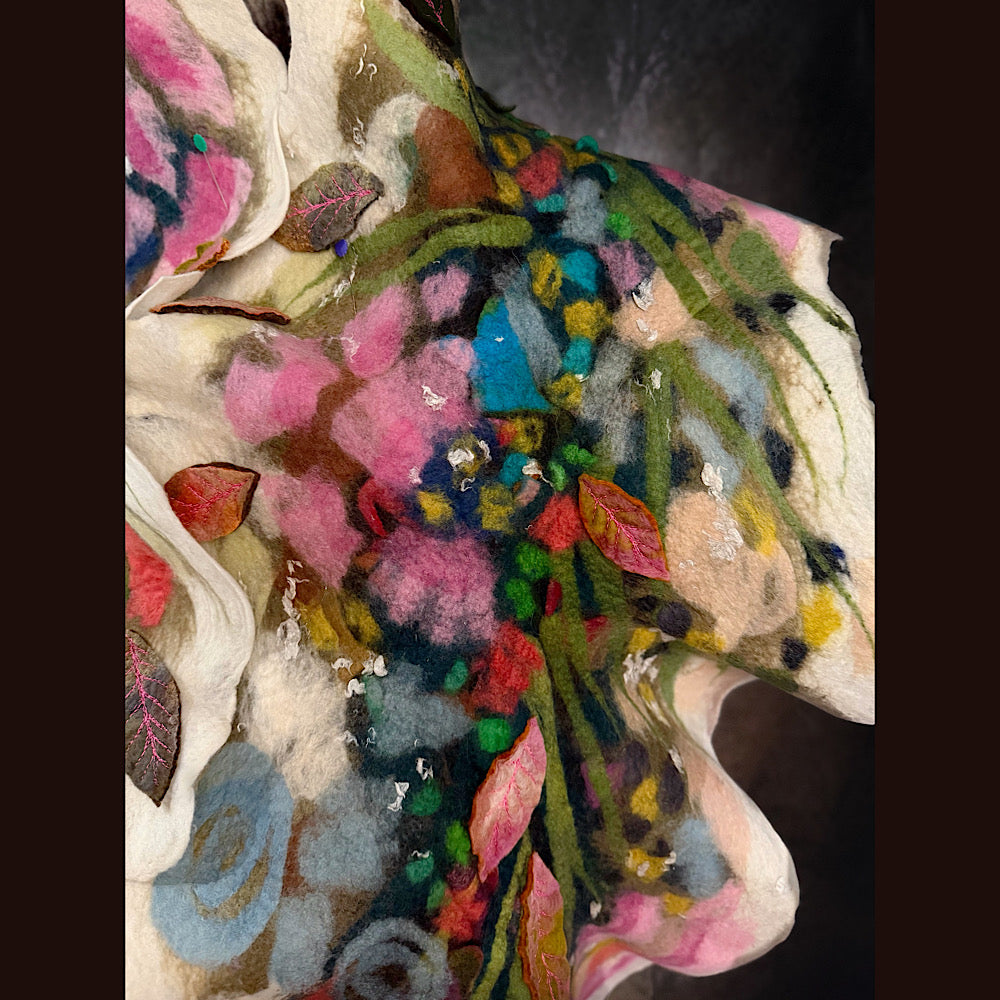The patterns on this shawl are made from scratch. I use roving I dye and draw on my felt, layering colors. There is no short cuts. I do not use commercially made fabrics or felt or paper to create this. Its all original, unique and handmade.