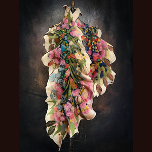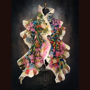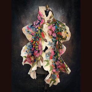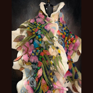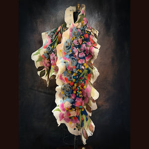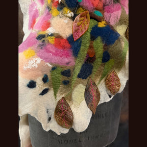 Expertly crafted from merino fiber, this ONE of a KIND very detailed felted scarf features a striking floral design that is sure to make a statement. This floral felt has been texturized with hand spun yarn bits and felt cuts from my felted flowers and leaves. I added many hand felted leaves with free motion stitching. Individually hand-dyed to achieve rich, saturated colors, this versatile piece can be worn in multiple styles.