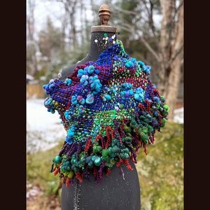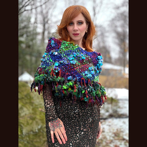 Expertly crafted from merino fiber, this scarf has been created by hand weaving hand spun art yarns. The woven section has been made on hand made loom especially crafted for this project and woven with my hand spun yarn. There is a considerable amount of yarns involved in this shawl. 5 different skeins have been spun to create that scarf shawlette. Just the fringe took an entire skein of hand spun. Everything is hand-dyed to achieve rich, saturated colors, this versatile piece can be worn in multiple styles.