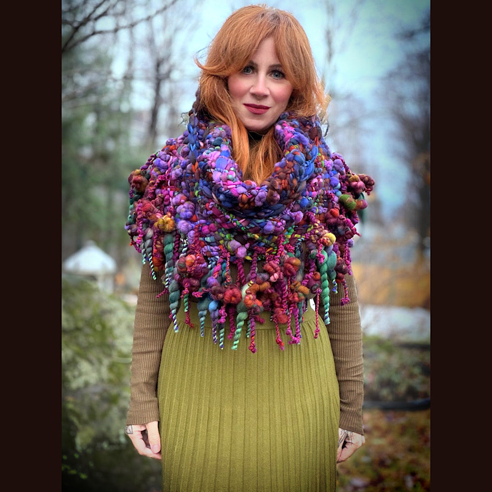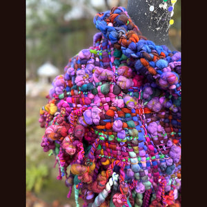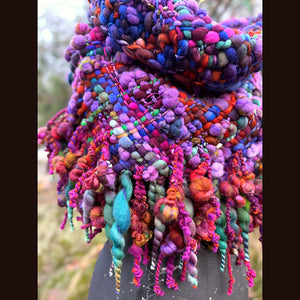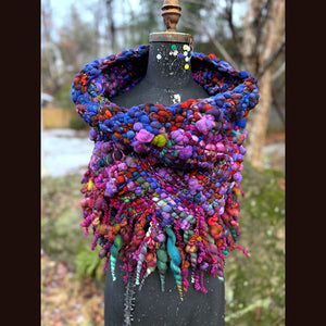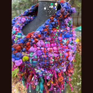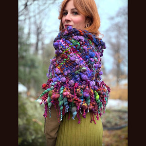 Expertly crafted from merino fiber, this shawl has been created by hand weaving hand spun art yarns. The woven section has been made on hand made loom especially crafted for this project and woven with my hand spun yarn. There is a considerable amount of yarns involved in this shawl. 5 different skeins have been spun to create that scarf shawlette. On this particular one I crocheted a border on top to add length and shape (see it can be folded). Just the fringe took an entire skein of hand spun. Everything is hand-dyed to achieve rich, saturated colors, this versatile piece can be worn in multiple styles.