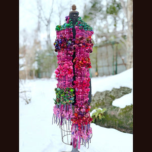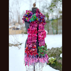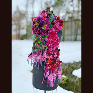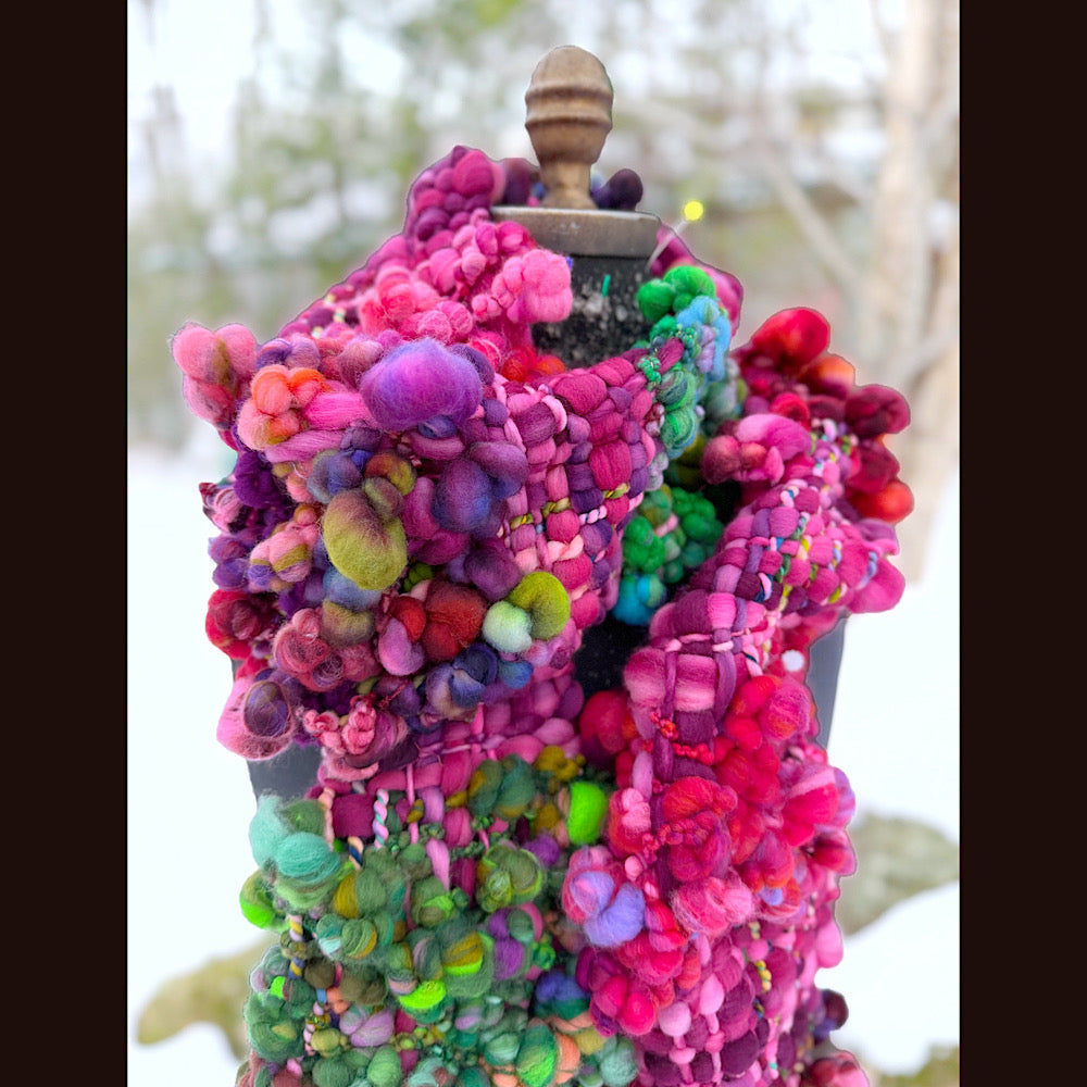 Expertly crafted from merino fiber, this shawl has been created by hand weaving hand spun art yarns. The woven section has been made on a rigid heddle loom. There is a considerable amount of yarns involved in this shawl. 5 different skeins have been spun to create this one of a kind woven scarf. Everything is hand-dyed to achieve rich, saturated colors, this versatile piece can be worn in multiple styles.