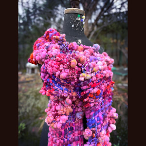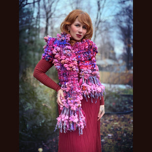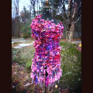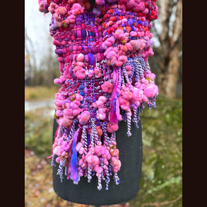Expertly crafted from merino fiber, this shawl has been created by hand weaving hand spun art yarns. The woven section has been made on a rigid heddle loom. There is a considerable amount of yarns involved in this shawl. 5 different skeins have been spun to create this one of a kind woven scarf. Everything is hand-dyed to achieve rich, saturated colors, this versatile piece can be worn in multiple styles.