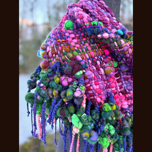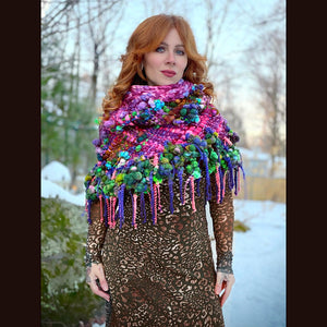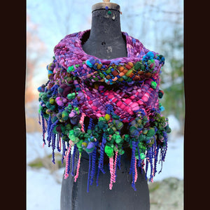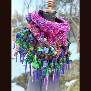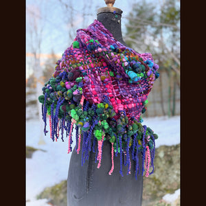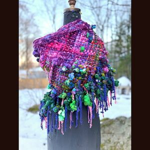 Expertly crafted from merino fiber, this shawl has been created by hand weaving hand spun art yarns. The woven section has been made on hand made loom especially crafted for this project and woven with my hand spun yarn. There is a considerable amount of yarns involved in this shawl. 5 different skeins have been spun to create that scarf shawlette. On this particular one I crocheted a border on top to add length and shape (see it can be folded). Just the fringe took an entire skein of hand spun. Everything is hand-dyed to achieve rich, saturated colors, this versatile piece can be worn in multiple styles.