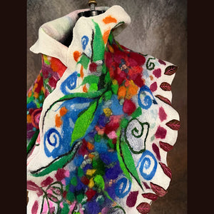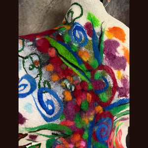 The patterns on this shawl are made from scratch. I use roving I dye and draw on my felt, layering colors. There is no short cuts. I do not use commercially made fabrics or felt or paper to create this. Its all original, unique and handmade.